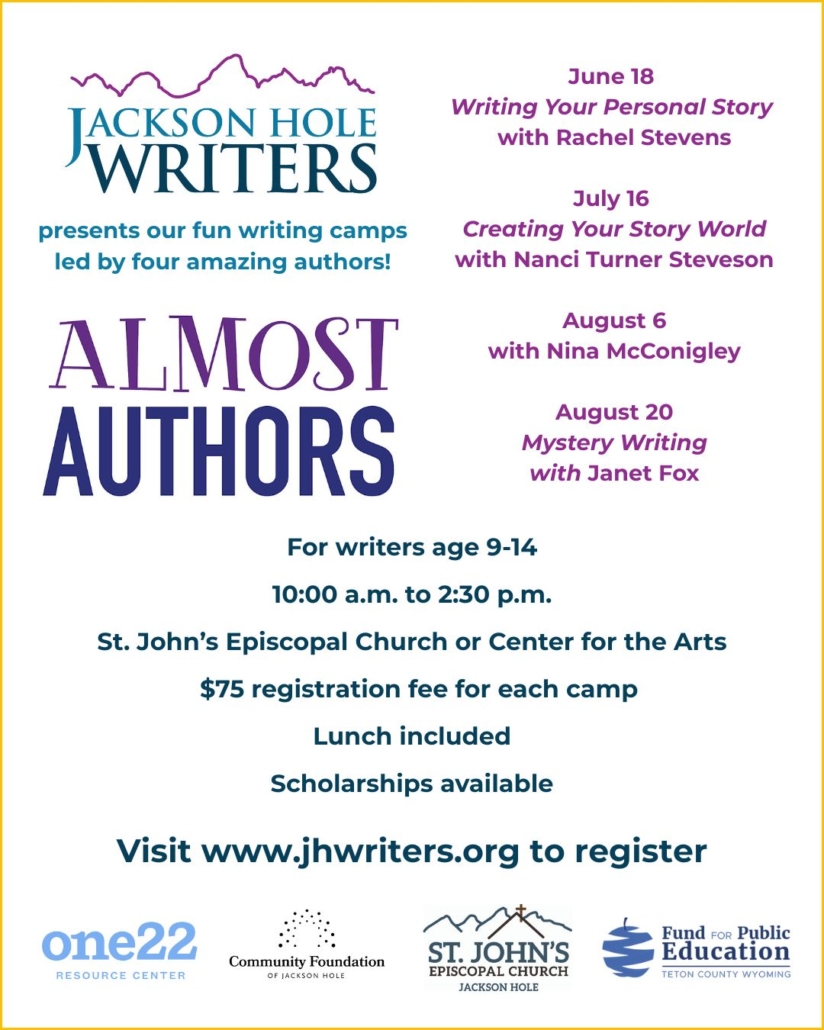 Jackson Hole Writers and our partners provide materials, lunch and snacks and the opportunity to purchase books by the author-mentors. Maximum of 20 attendees. See the schedule and our guest authors below.